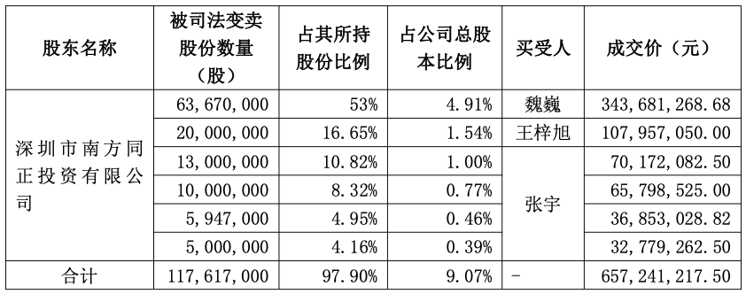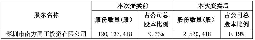 本次变卖前,南方同正持有120,137,418股,占公司总股本比例9.26%;本次变卖后,南方同正持有2,520,418股,占公司总股本比例降至0.19%。