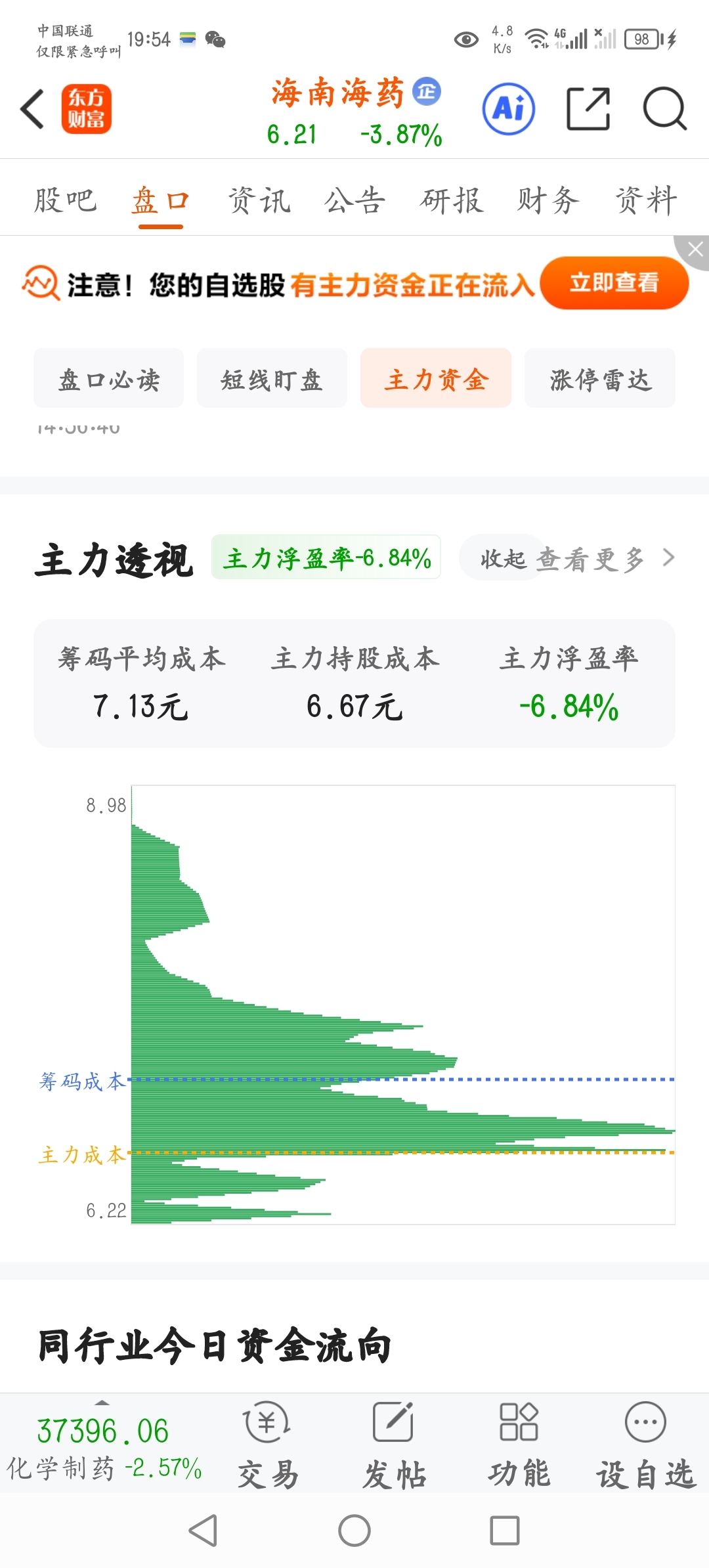 $海南海药(SZ000566)$ 第一次见主力成本在水下,能守住吗?