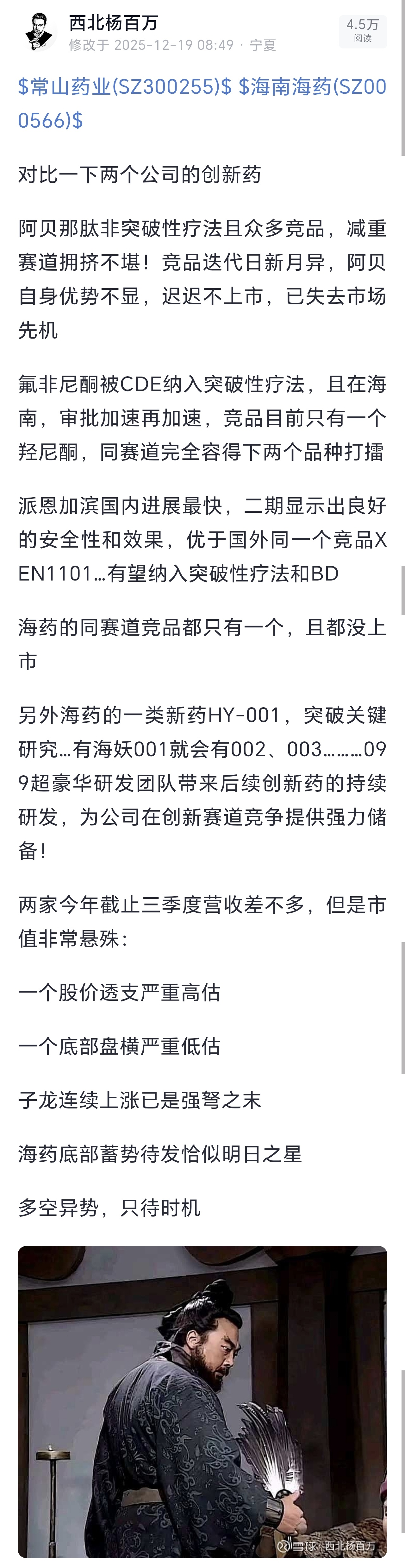 做个标记:12.19日早盘发的帖子常山股价62.1~今天45.5海药股价6.58