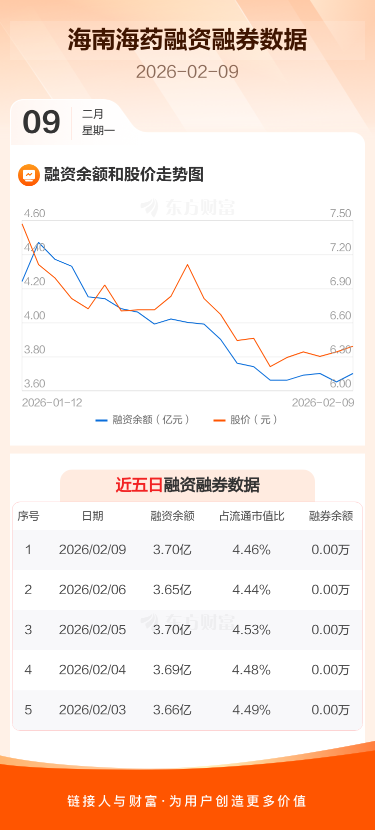 交易所最新数据显示,海南海药于2026年2月9日获融资买入2013.76万元,融资偿还1512.21万元,当日融资净买入501.55万元。目前,该股融资余额3.70亿,占流通市值比例为4.46%。