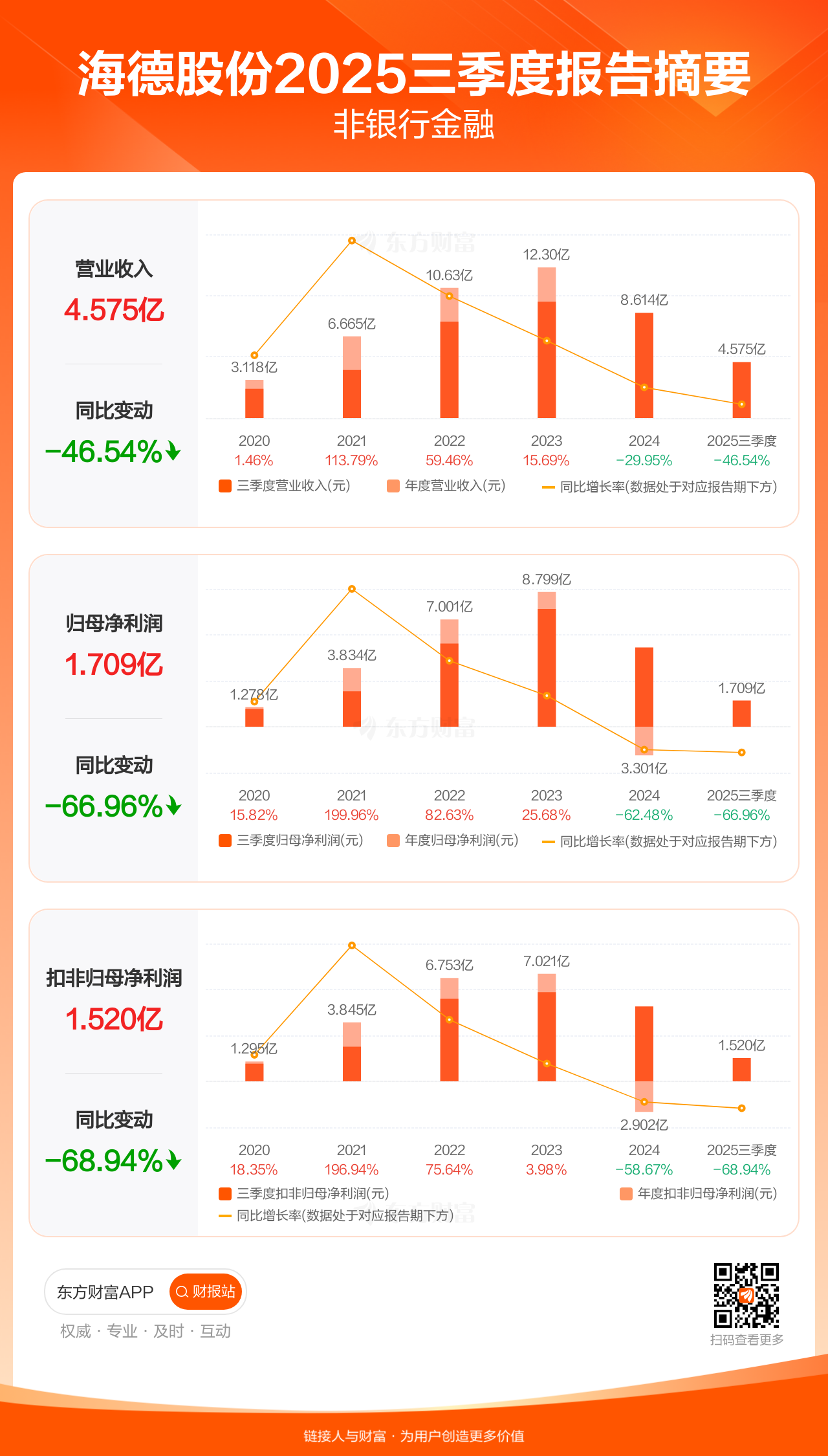 海德股份10月30日发布2025年三季报显示,公司前三季实现营业收入4.57亿元,同比下滑46.54%;归母净利润1.71亿元,同比下滑66.96%;扣非归母净利润1.52亿元,同比下滑68.94%。