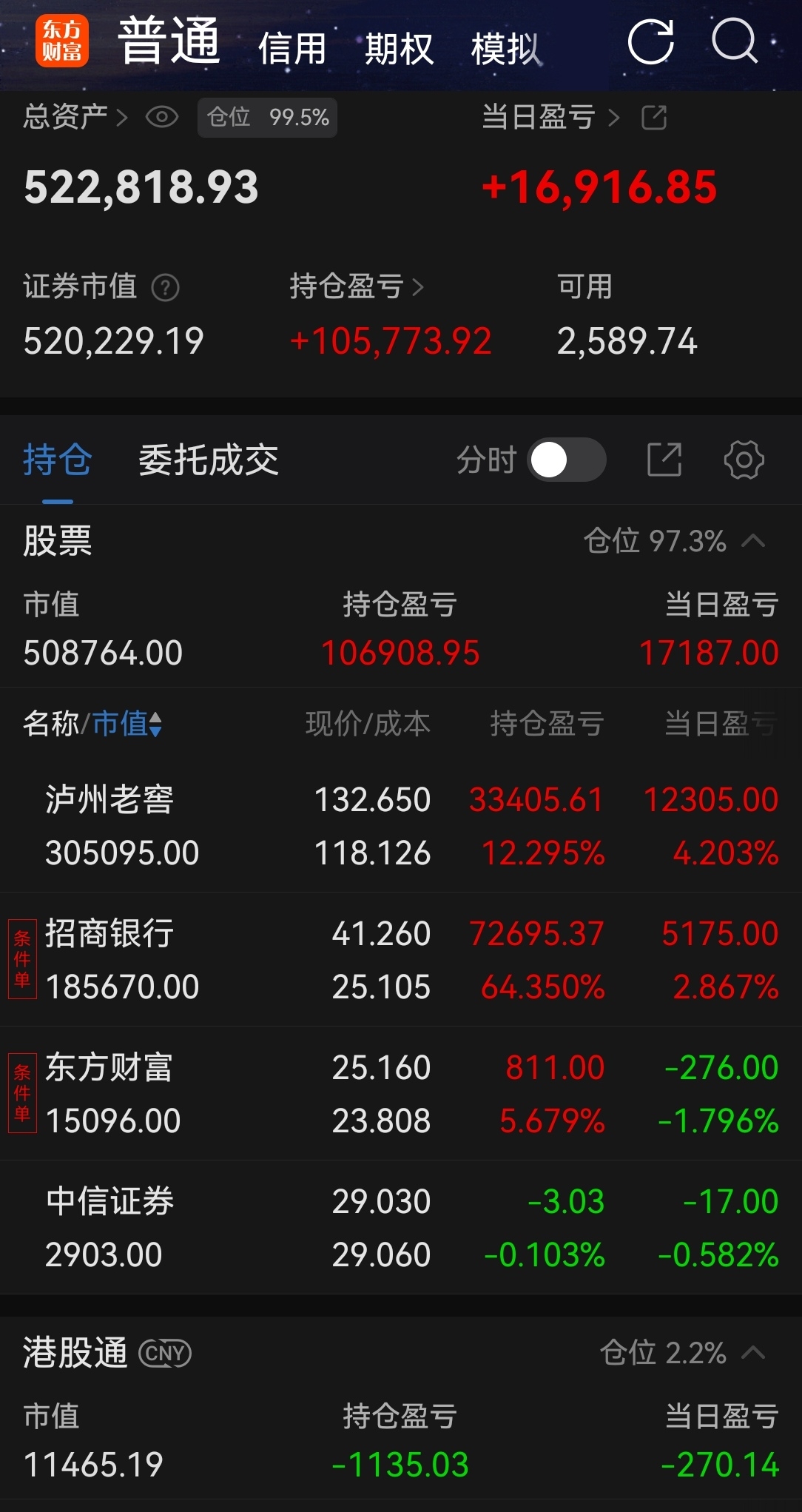 今天浮盈1.69万元,无操作。说实话没什么感觉,但涨总比跌好。