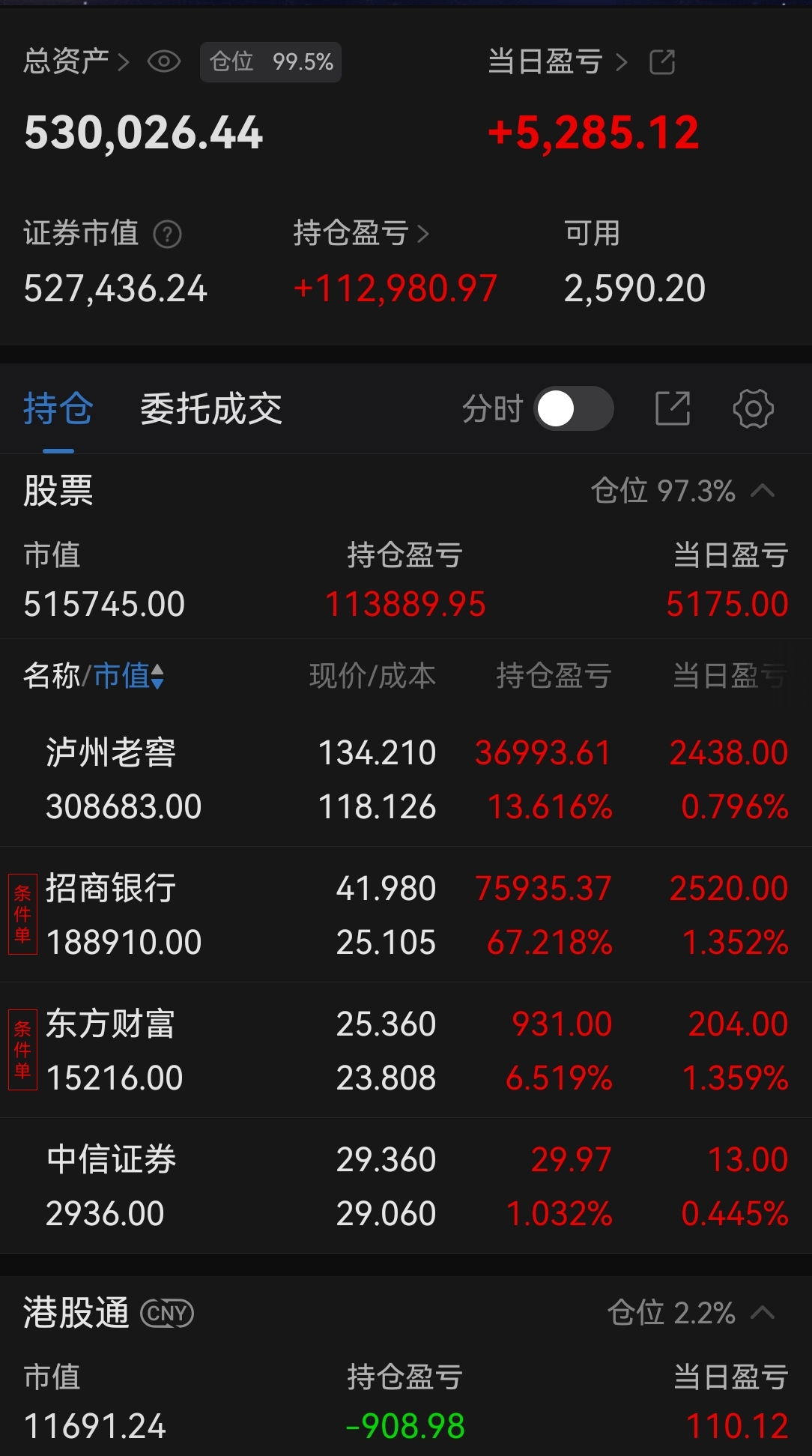 今天浮盈5285元,无操作。股市起起伏伏,心情平平无奇。