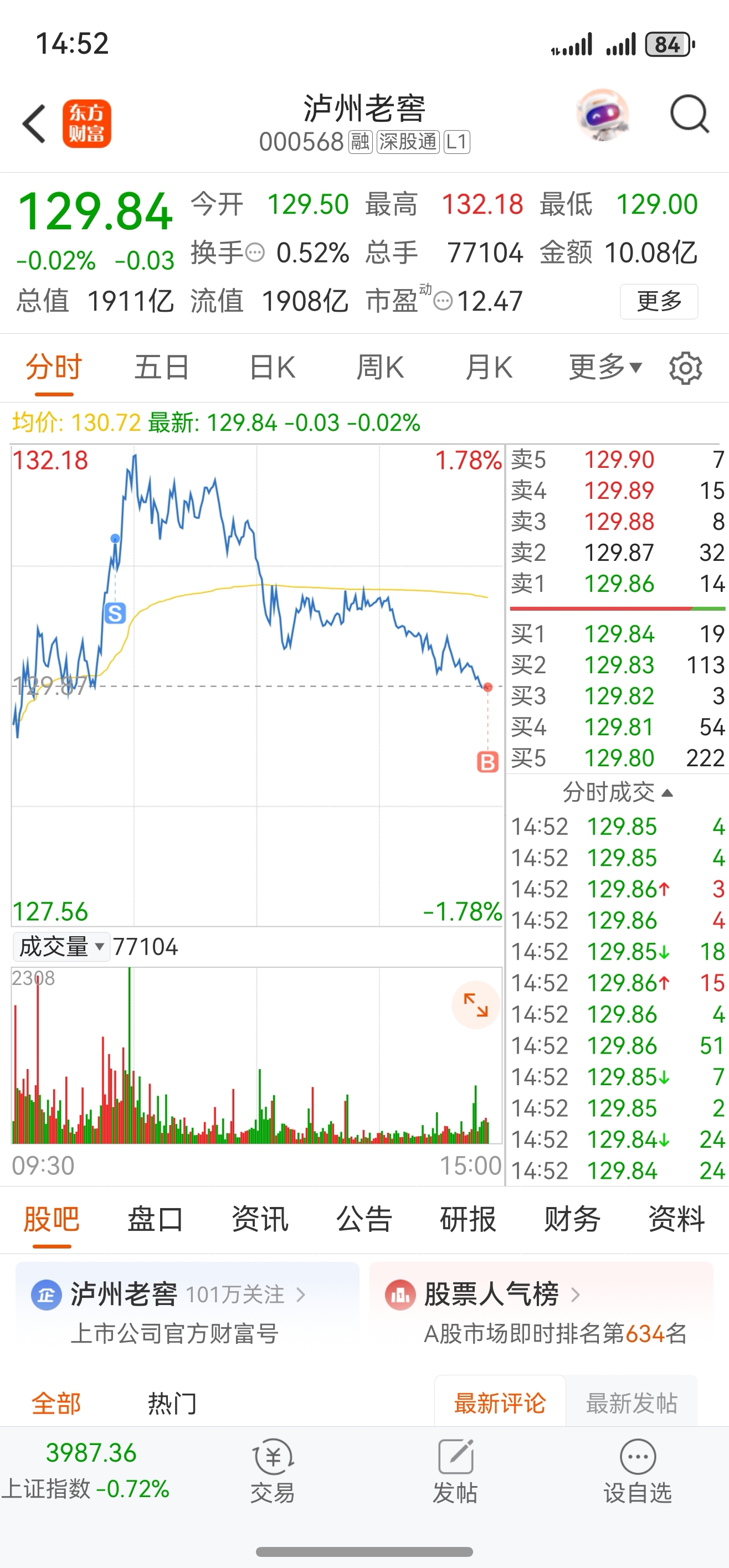 $泸州老窖(SZ000568)$ 今天做了一个T,