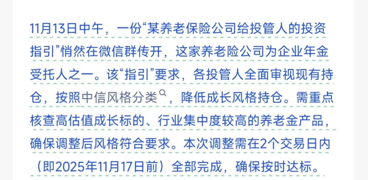 今天中午券商中国传了个消息,说有养老保险给投管人发指引,要两日内降低成长风格持仓