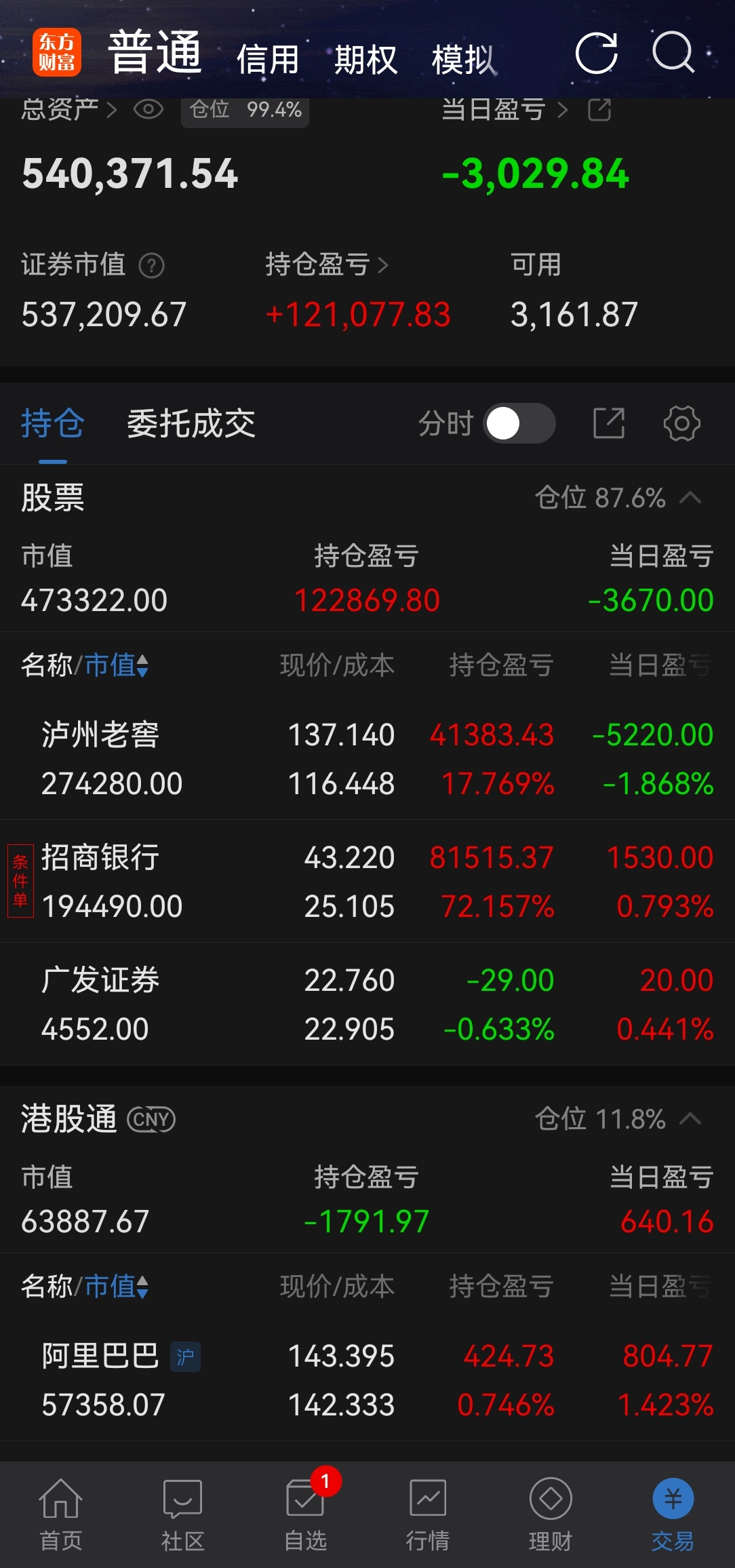 今日浮亏3029元,无操作。老窖领跌。
