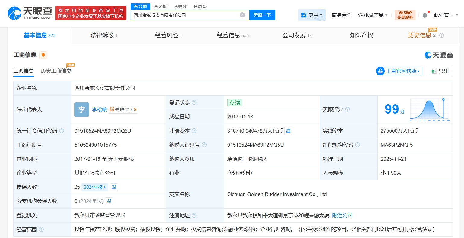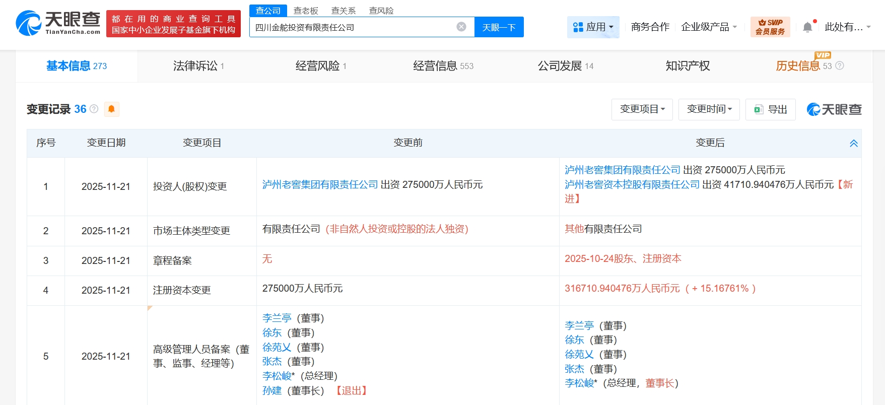 天眼查工商信息显示,近日,四川金舵投资有限责任公司发生工商变更,新增泸州老窖资本控股有限责任公司为股东,注册资本由27.5亿元人民币增至约31.7亿元人民币,增幅约15%,同时,孙建卸任董事长,由李松峻接任。四川金舵投资有限责任公司成立于2017年1月,法定代表人为李松峻,经营范围为投资与资产管理、股权投资、债权投资、企业并购、投资信息咨询、企业管理咨询。股东信息显示,该公司现由泸州老窖集团有限责任公司、泸州老窖资本控股有限责任公司共同持股。