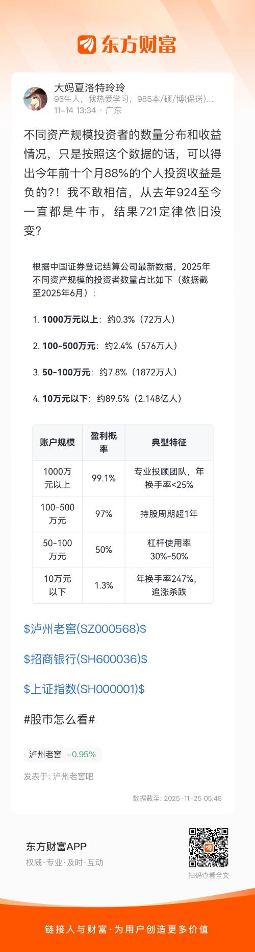 不同资产规模投资者的数量分布和收益情况,只是按照这个数据的话,可以得出今年前十个月88%的个人投资收益是负的?!我不敢相信,从去年924至今一直都是牛市,结果721定律依旧没变?