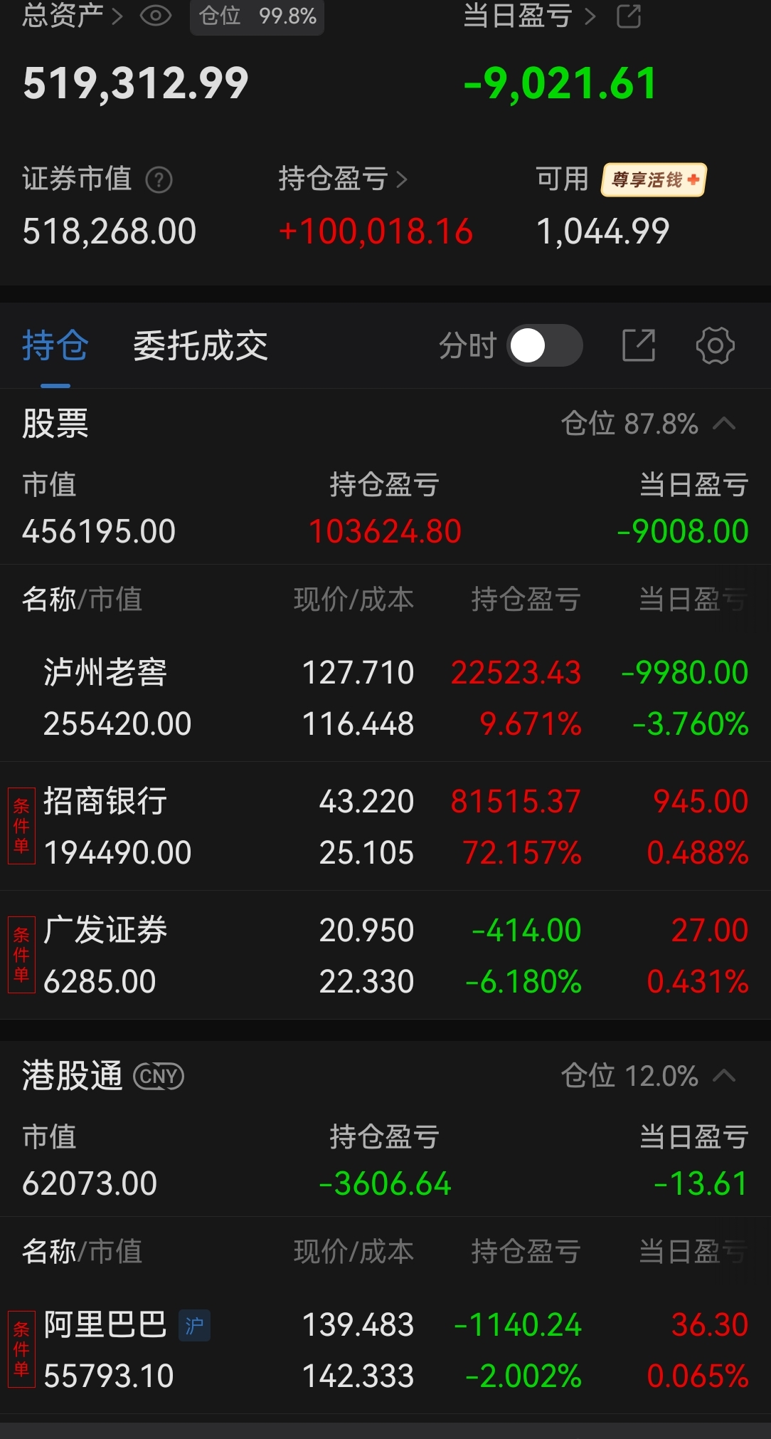 今天浮亏约9000元,无操作。基本都是老窖亏的,盘中老窖跌到了我的上一个加仓点。