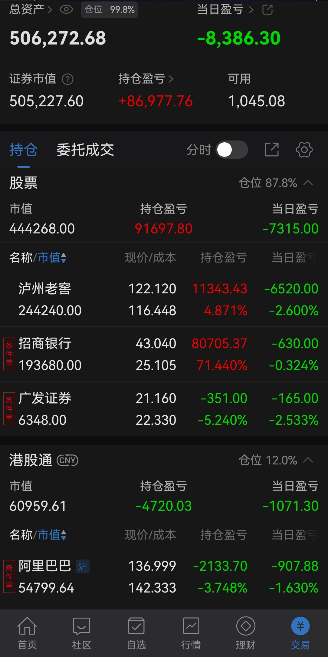 今天浮亏约8300元,无操作。今天依旧是老窖在主跌,截至今天今年的浮盈应该已经重新跌至八月份左右。