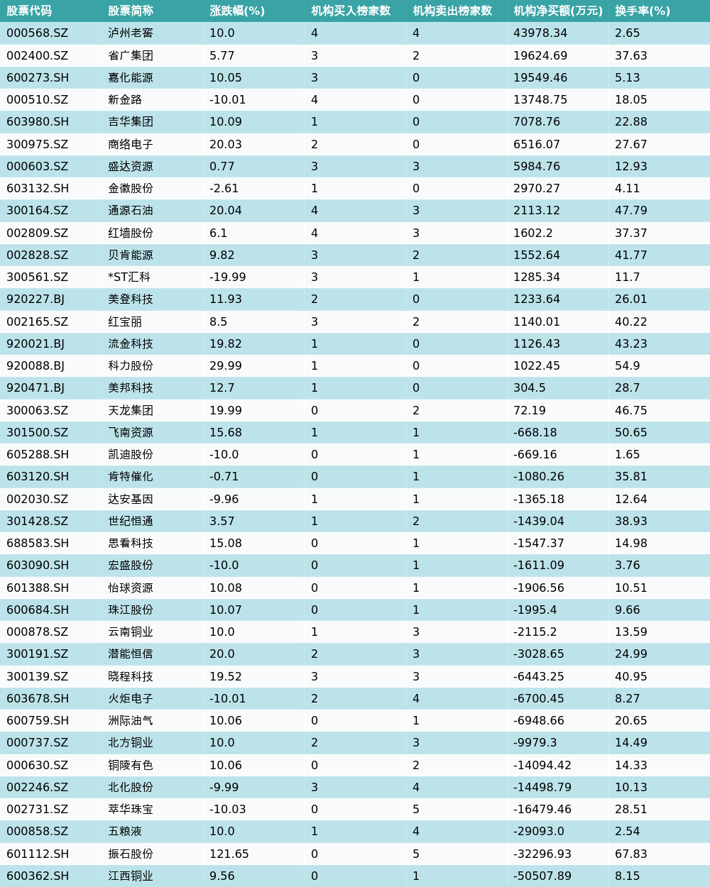 南财智讯1月29日电,盘后数据显示,因当日异动登上龙虎榜的个股中,39只沪深A股龙虎榜出现了机构的身影,机构合计净卖出73564.62万元,具体来看,机构净买入18只个股,净卖出21只个股。其中,机构净买入前三分别为泸州老窖(000568.SZ)、省广集团(002400.SZ)与嘉化能源(600273.SH),详情见下图:机构净卖出的个股中,前三分别为江西铜业(600362.SH)、振石股份(601112.SH)与五粮液(000858.SZ)。