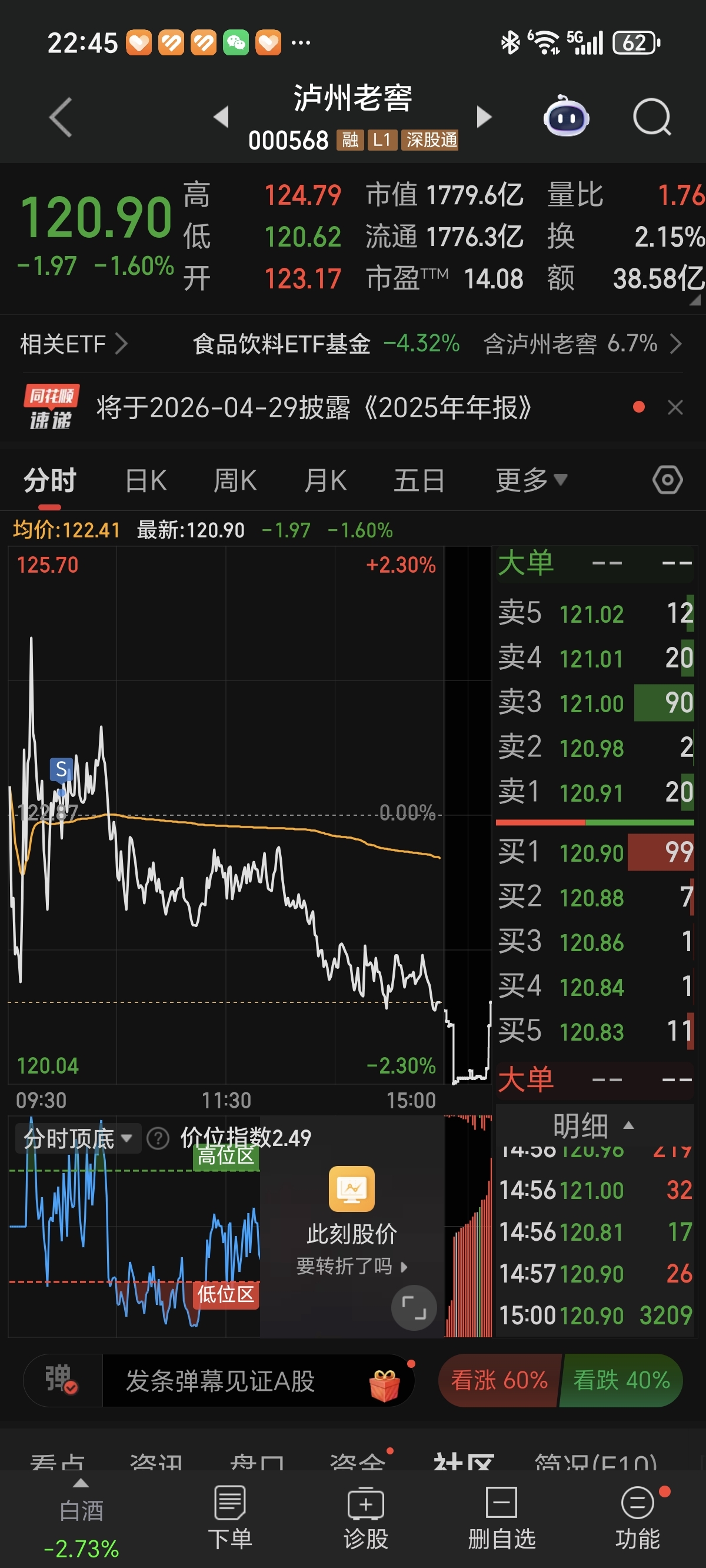 早上开盘犹豫了好久,123.1清仓了,买了39天赚了9500块,感谢老窖让我全身而退,今天还是挺强势的,买其他酒今天可能跌5~6个点等于白忙活,合适的时候我还会再回来。