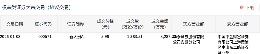 新大洲A今日大宗交易平价成交1383.51万股,成交额8287.2万元