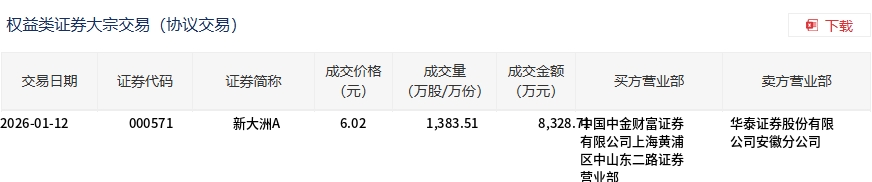 新大洲A今日大宗交易平价成交1383.51万股,成交额8328.71万元
