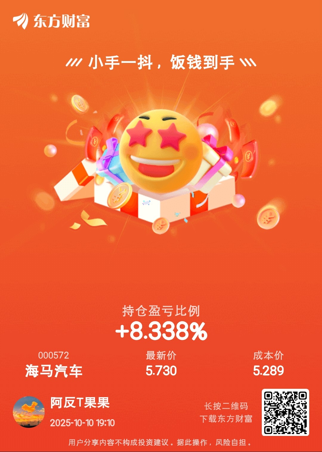 $海马汽车(SZ000572)$ 补仓到盈利,中长线投资了