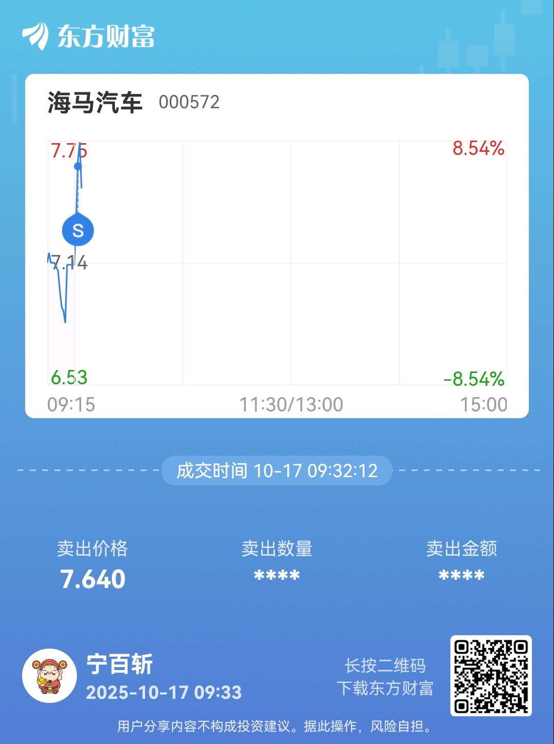 $海马汽车(SZ000572)$ 有事不能盯盘,只能卖了,感恩。