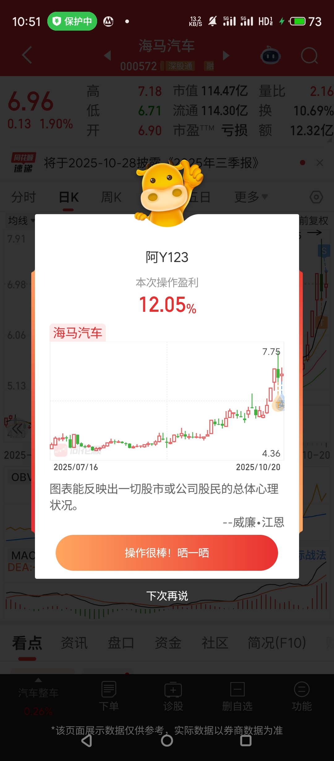 $海马汽车(SZ000572)$ 七块钱上方全走了,尾盘够便宜我再回来,不便宜我就不回来了,专心去搞北方国际了,去那头11.20狠狠加仓