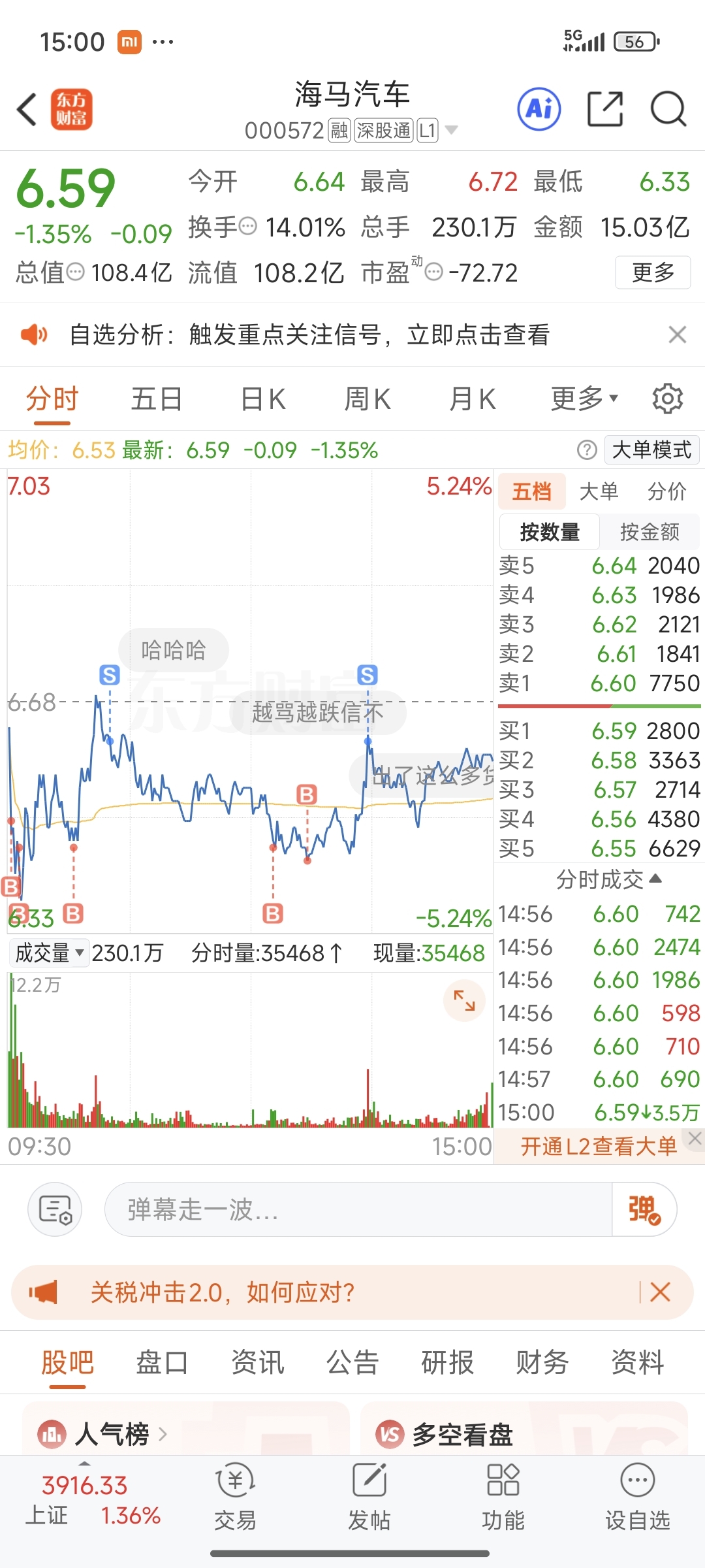 $海马汽车(SZ000572)$ 硬生生做T才保持今天红一个点,太拉跨了