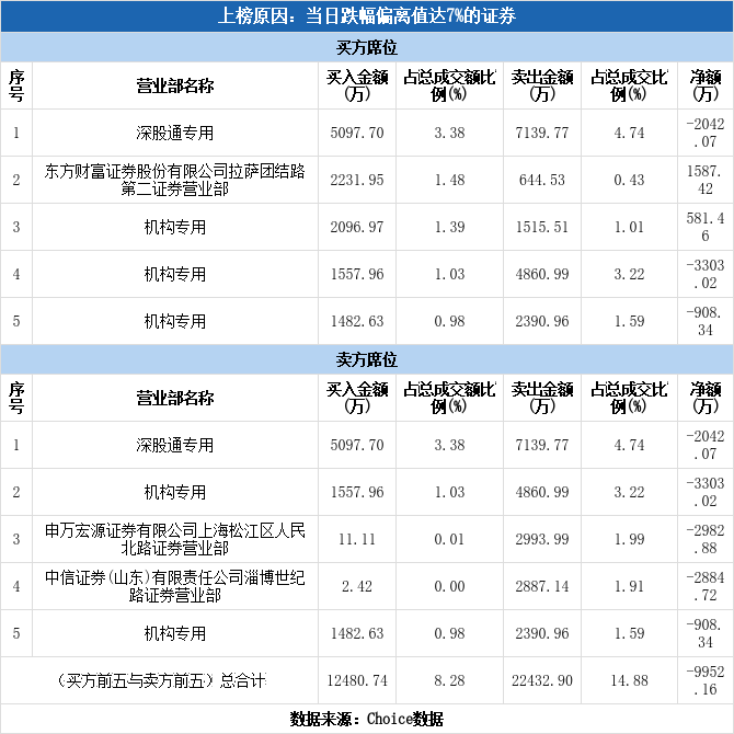 龙虎榜数据显示,今日共5个机构席位出现在龙虎榜单上,分别位列买三、买四、买五、卖二、卖五,合计净卖出3629.91万元,占龙虎榜净卖额的36.47%。