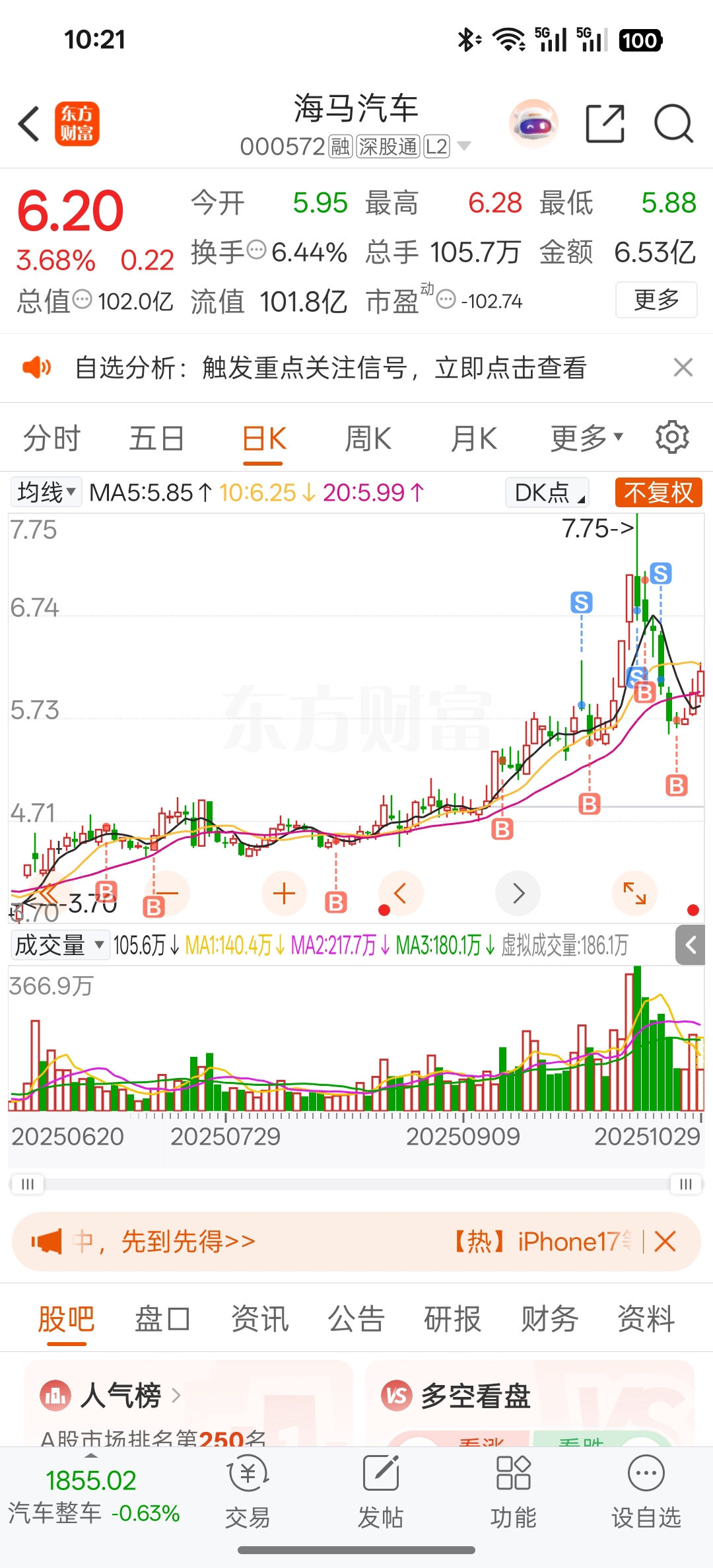 $海马汽车(SZ000572)$ 我今天没动,今天的上涨完全是海南板块带动,但是前期A杀压力太大,主力直接拉上去压力也不小。可以考虑减仓,反正我近期应该不动。