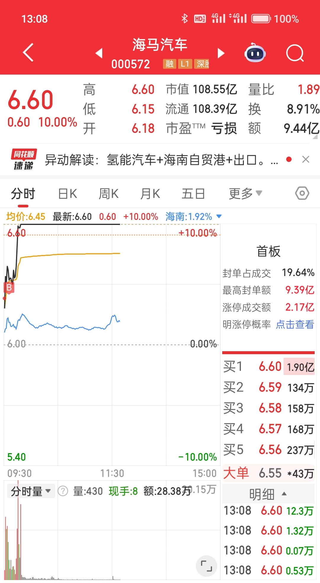 $海马汽车(SZ000572)$ 差点没能上车,之前感觉跌幅不够,反弹两天,突破20天线压制,缩量回踩五天线,预期今天是低开确认支撑再拉起的剧本。结果高开3个点超预期,一看竞价成交1200万,并无明显方量痕迹,差点放弃了……