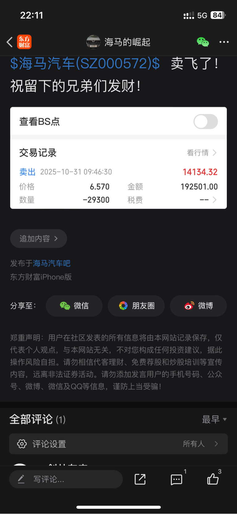 $海马汽车(SZ000572)$ 虽然我上个交易日卖飞了!但是我不唱空!明天必定大涨!不要听那些唱空的!