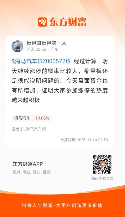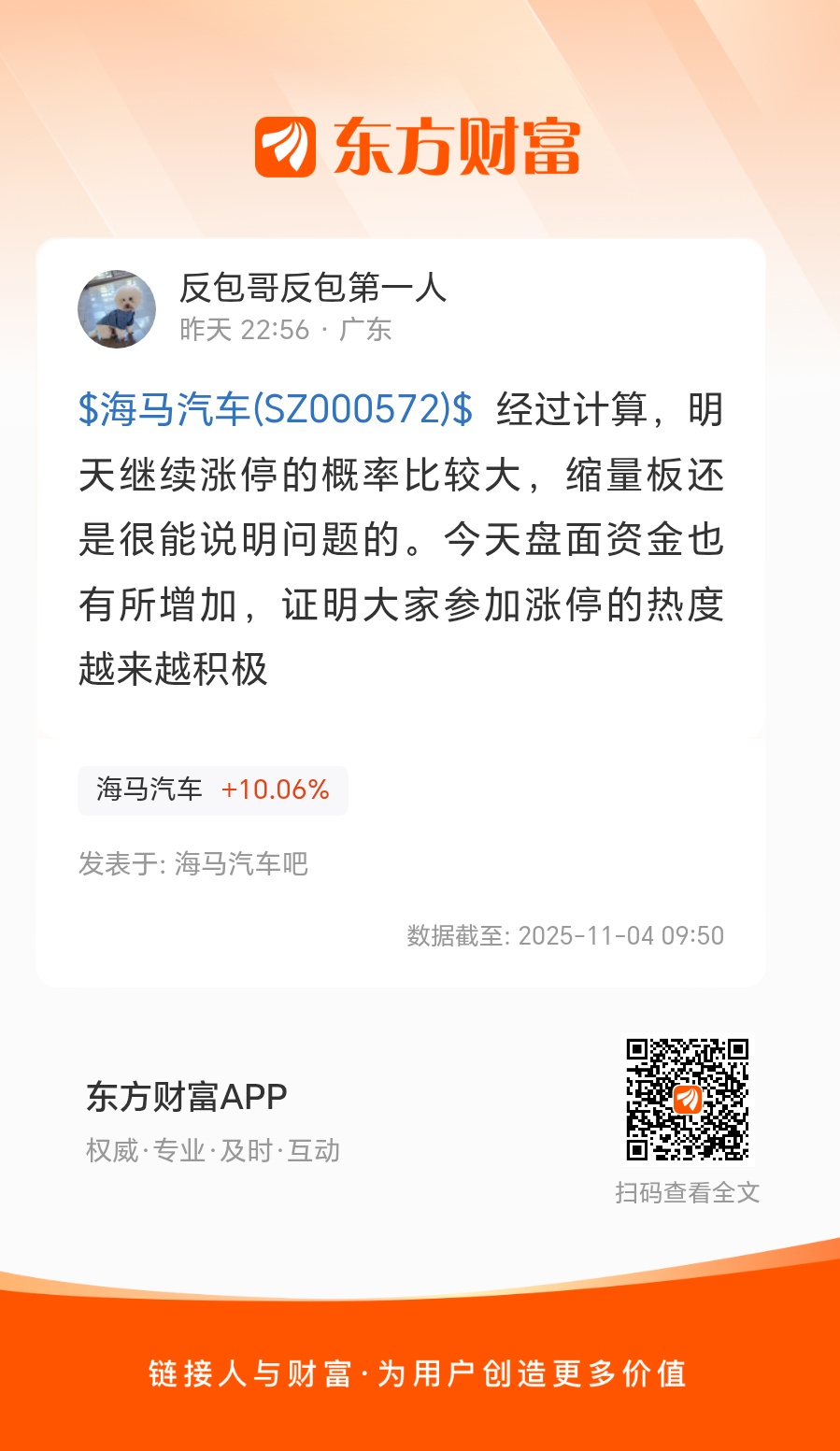 $海马汽车(SZ000572)$ 经过计算,明天继续涨停的概率比较大,缩量板还是很能说明问题的。今天盘面资金也有所增加,证明大家参加涨停的热度越来越积极