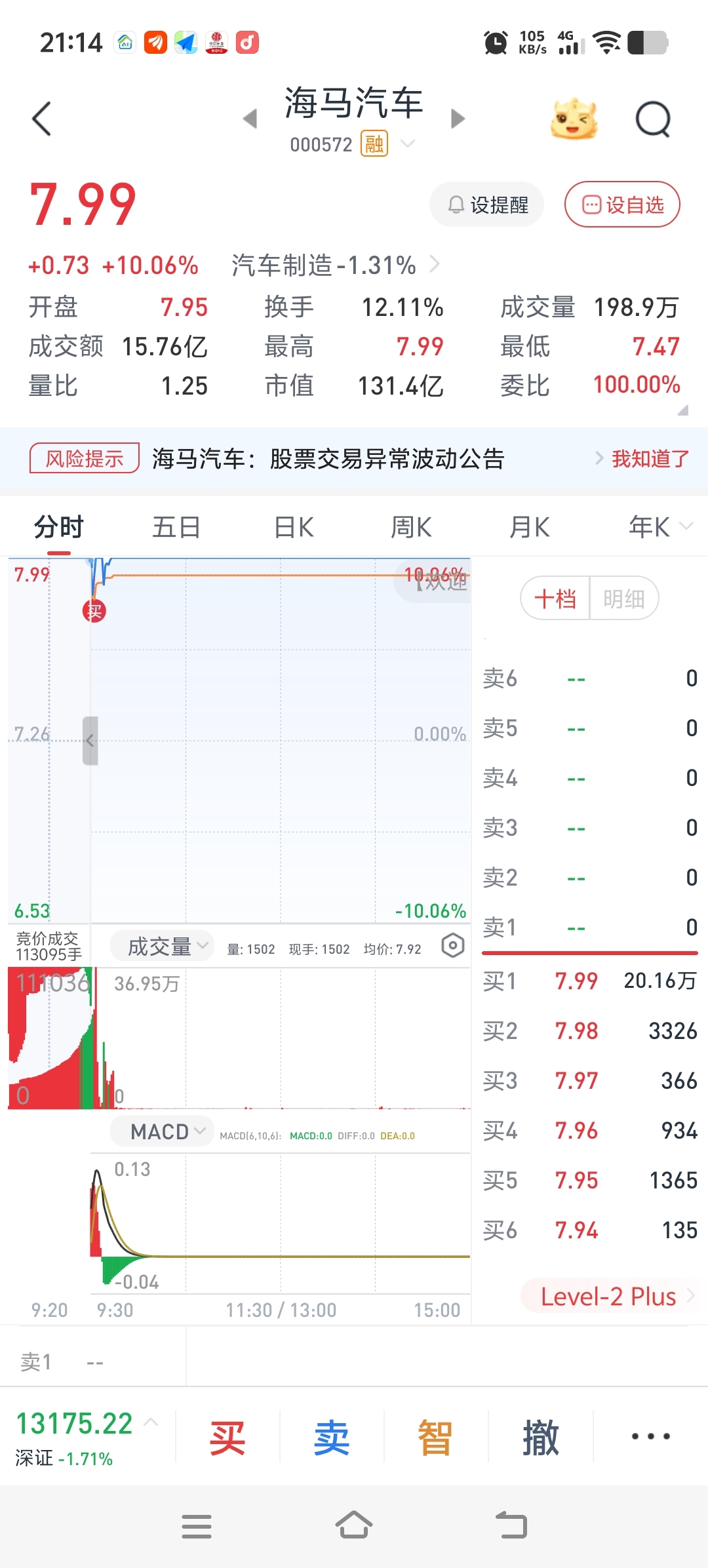 $海马汽车(SZ000572)$ 今天开盘秒进了,马字辈、海峡两岸、低价、汽车整车、无人驾驶等多种概念叠加,感觉会妖起来!