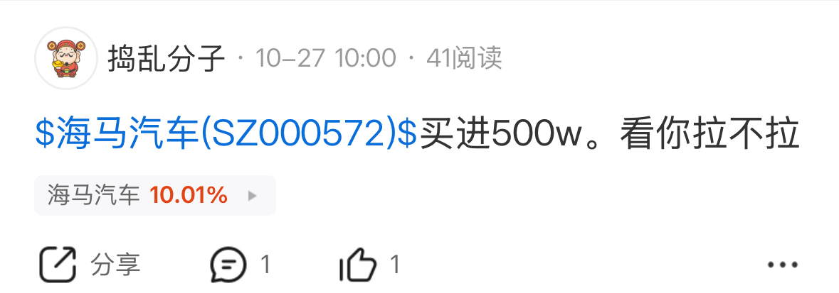 $海马汽车(SZ000572)$ 哈哈 今年去海南看看海马工厂