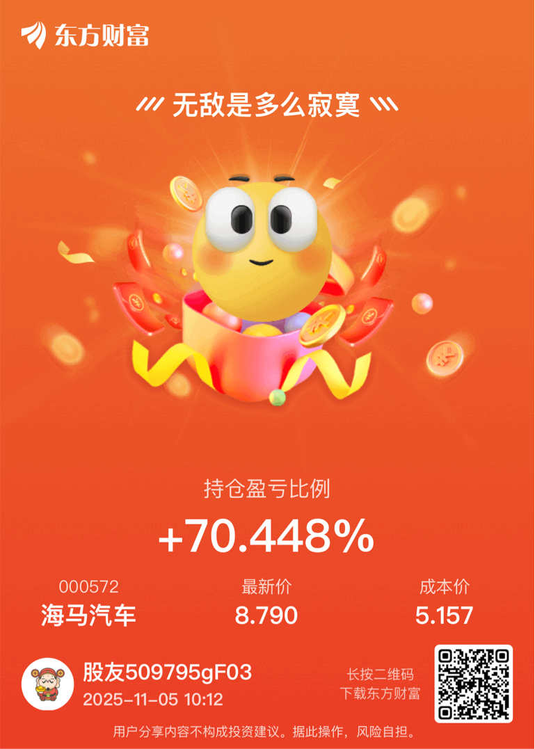 $海马汽车(SZ000572)$ 符合自己的盈利预期就走,敢博大肉就趴下别动,反正我不到翻倍绝不离场