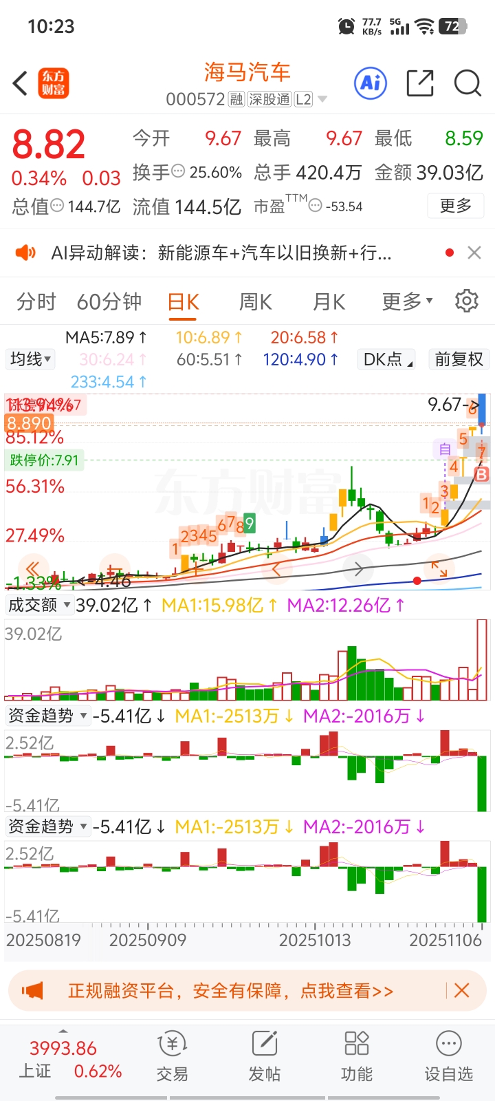 $海马汽车(SZ000572)$ 是跌停还是涨停