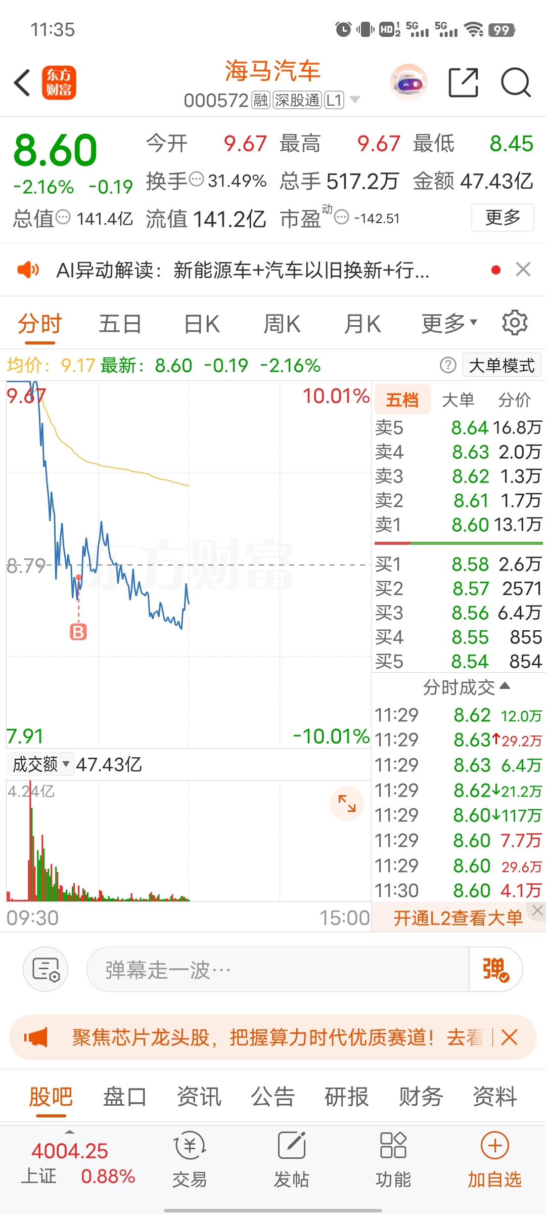 $海马汽车(SZ000572)$ 先建个底仓,午后继续加仓买入