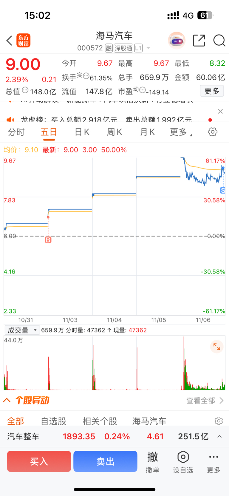 $海马汽车(SZ000572)$ 早盘大单一字把我骗了