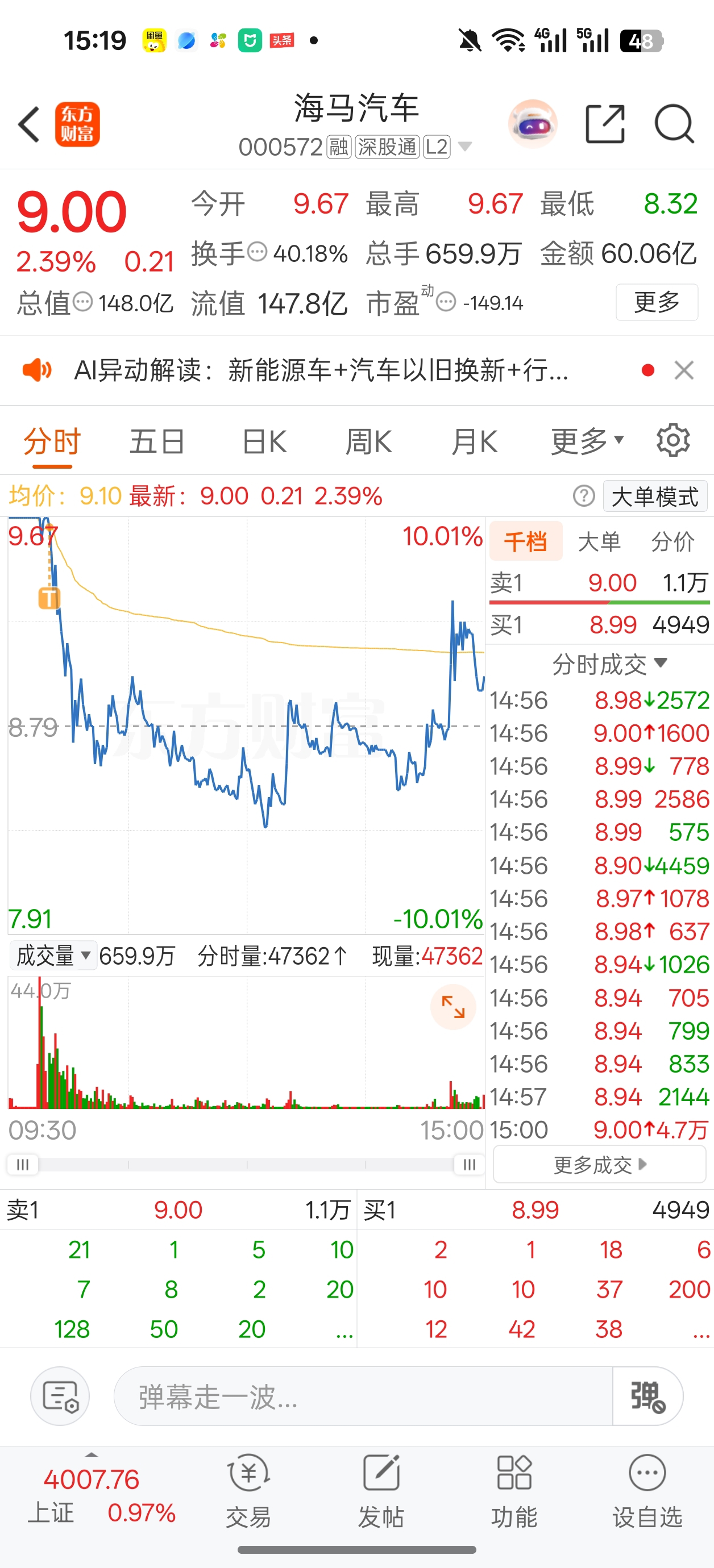 $海马汽车(SZ000572)$ 今天手贱涨停踢出来了迷迷瞪瞪又涨停买进去了,然后一路下跌,想着今天这个量肯定跌停了,气得我自己扇了自己几巴掌,一点开盘看了一下睡午觉了,做梦都是跌停了,三点多打开手机以来竟然红了我的天老爷,要不然我得少十几个利润,这种票真是没几个人拿的住,今天估计要跑都跑完了吧,这么大的量谁敢进来,后面一想真是炒股反人性