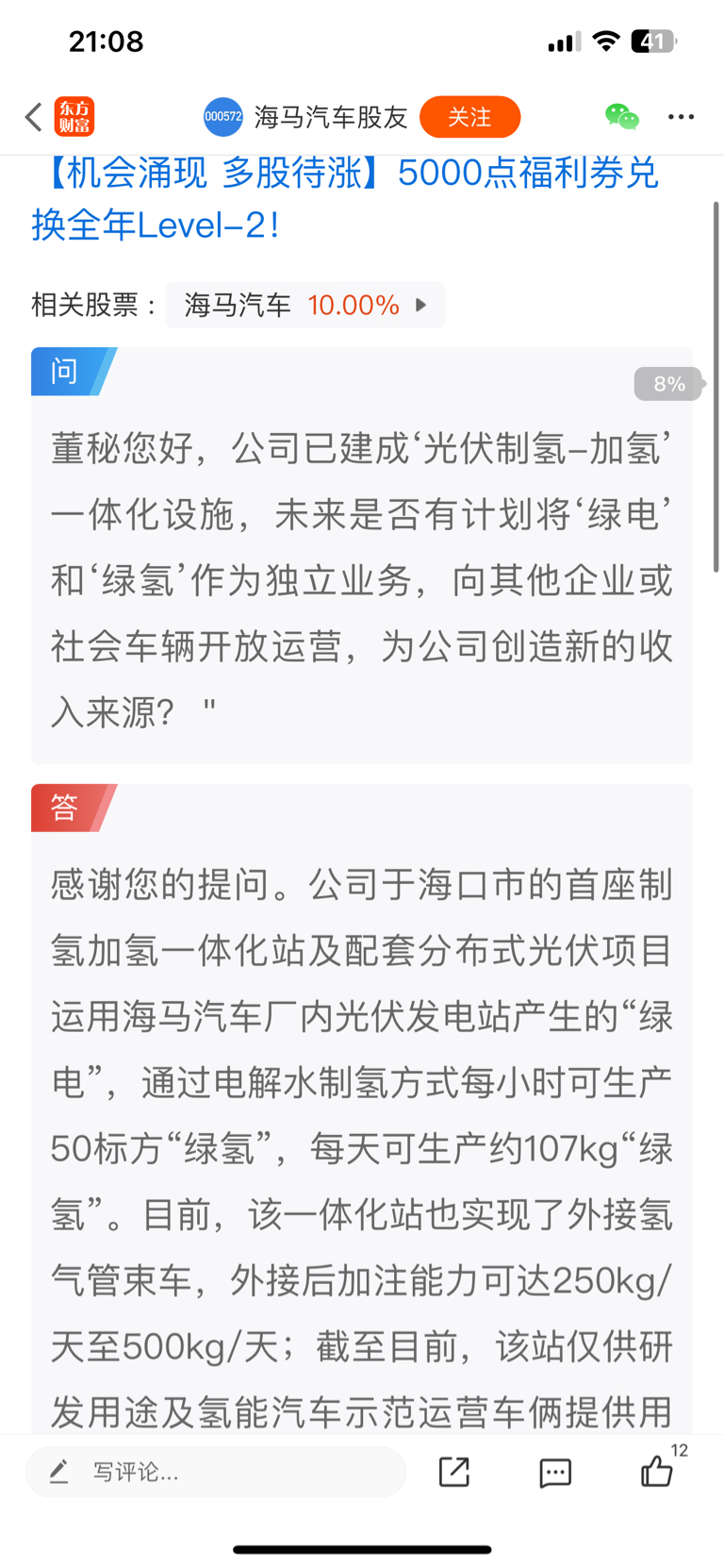 $海马汽车(SZ000572)$ 有氢能源 光伏是碳中和
