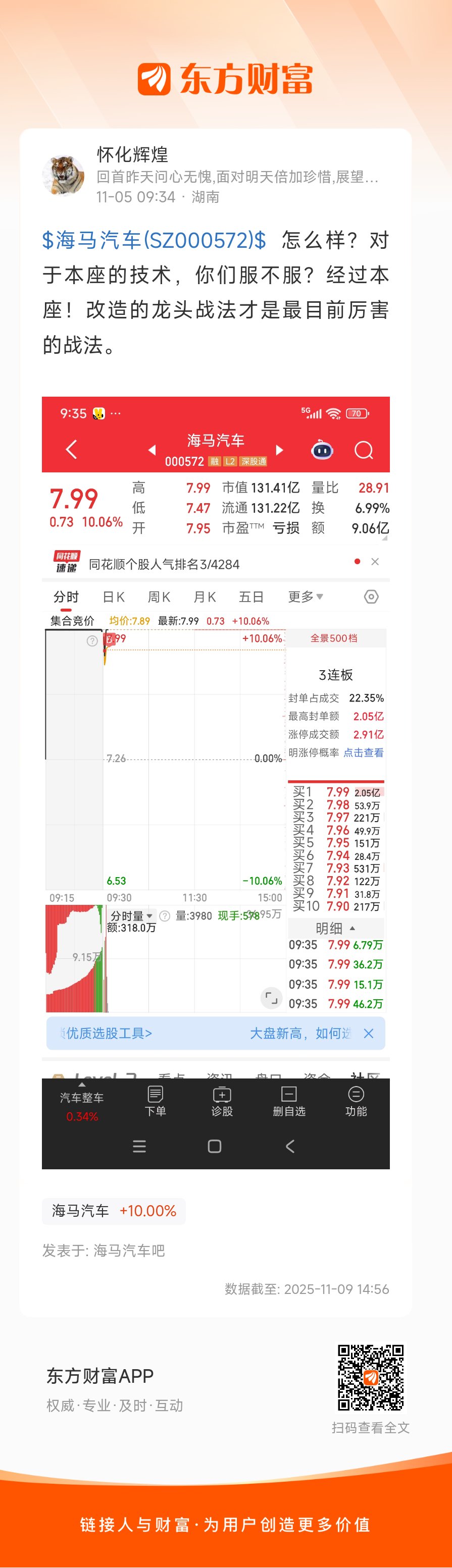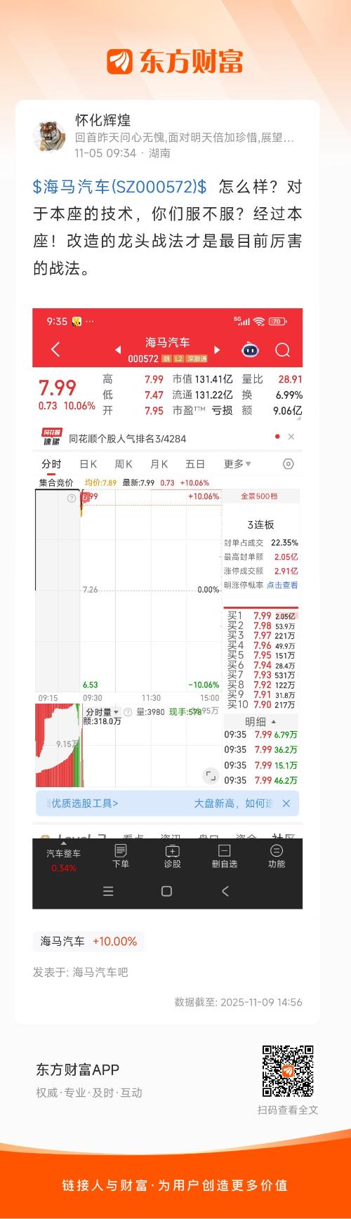 $海马汽车(SZ000572)$  怎么样?对于本座的技术,你们服不服?经过本座!改造的龙头战法才是最目前厉害的战法。