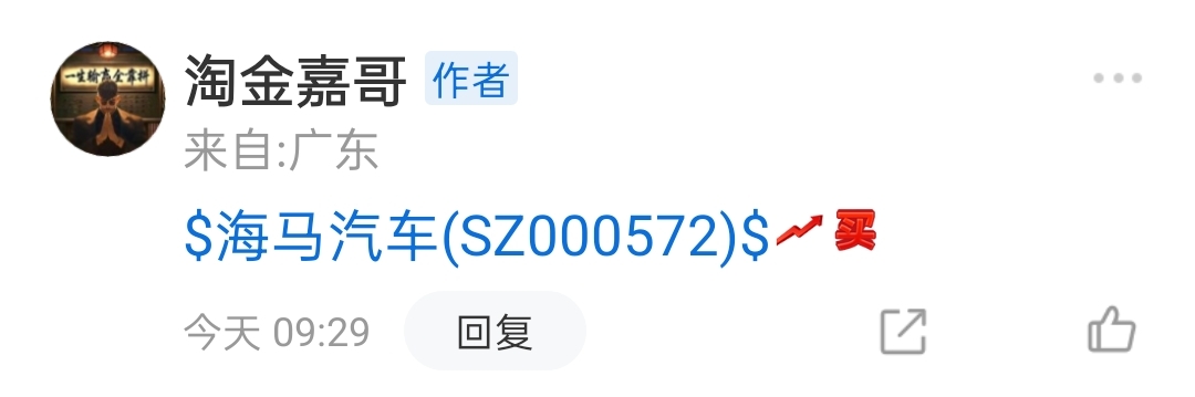 $海马汽车(SZ000572)$ 周一给同学来了个开门红哈 周一关注嘉哥你的持仓会红红火火恍恍惚惚滴哈
