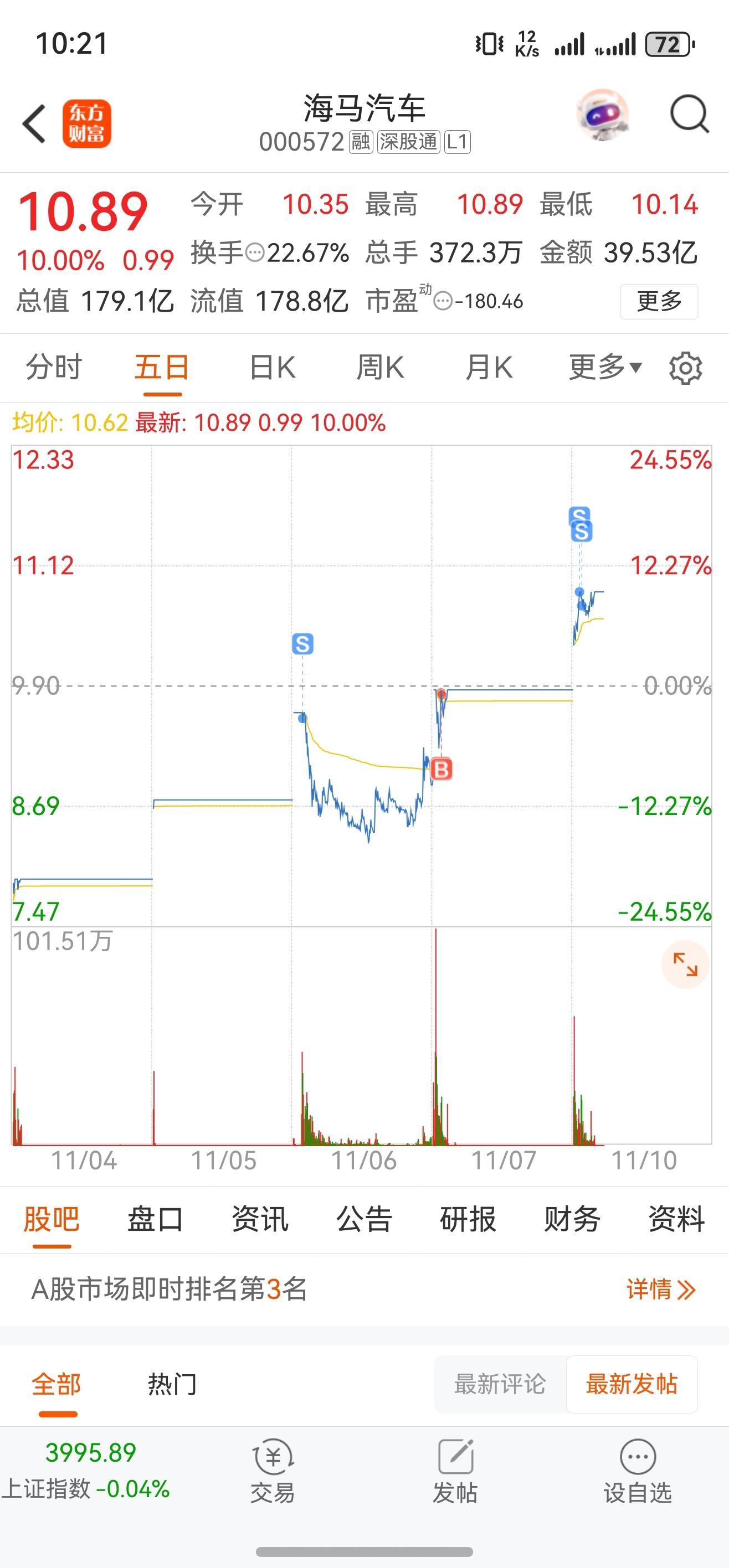 $海马汽车(SZ000572)$ 全仓吃了接近60个点,本来是减半了,结果还是没拿住,留下的兄弟吃肉,希望海马破20