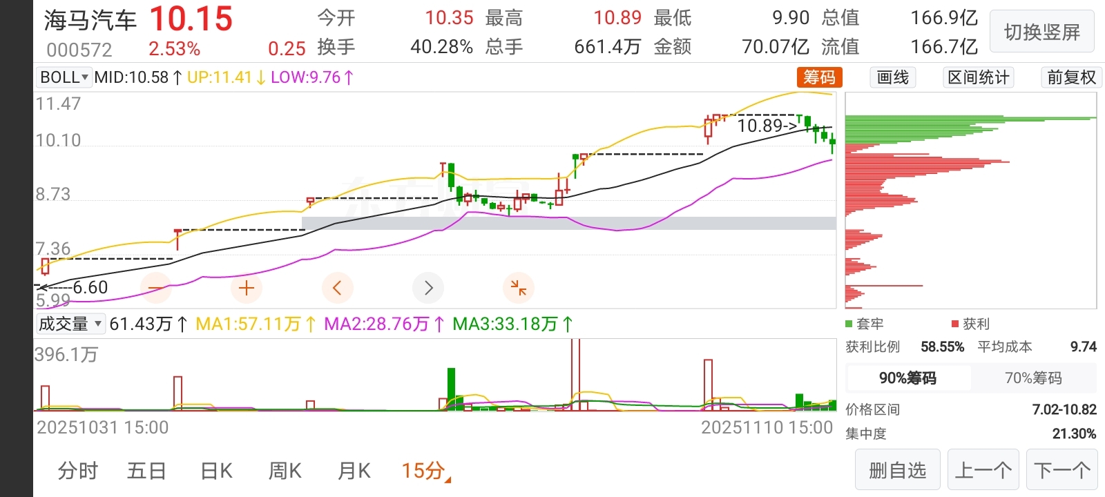 $海马汽车(SZ000572)$ 明天看看9.75附近能不能撑得住,估计有一拼死拼活,大概率趋势行情可能已经结束,接下来2日找个底寻个反弹吧