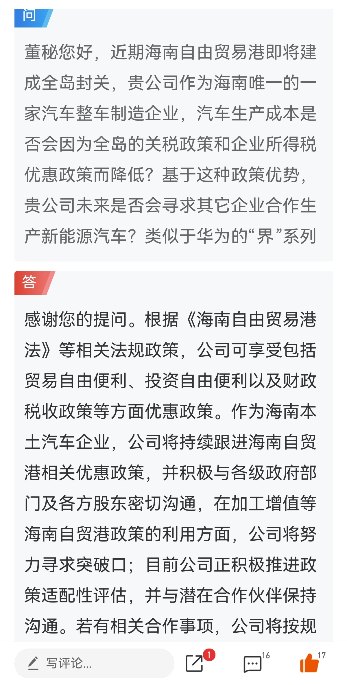$海马汽车(SZ000572)$ 和华为或是其他大企业合作,几乎是板上钉钉的事情!我们股民能想到的,公司董事不可能想不到!由于唯一免税资质对应众多合作伙伴,和谁合作,怎么合作,怎么把免税利益最大化,怎么把企业价值最大化是公司懂事要选择考虑的。幸福的烦恼,搞好了,远超赛力斯!$赛力斯(SH601127)$ $比亚迪(SZ002594)$