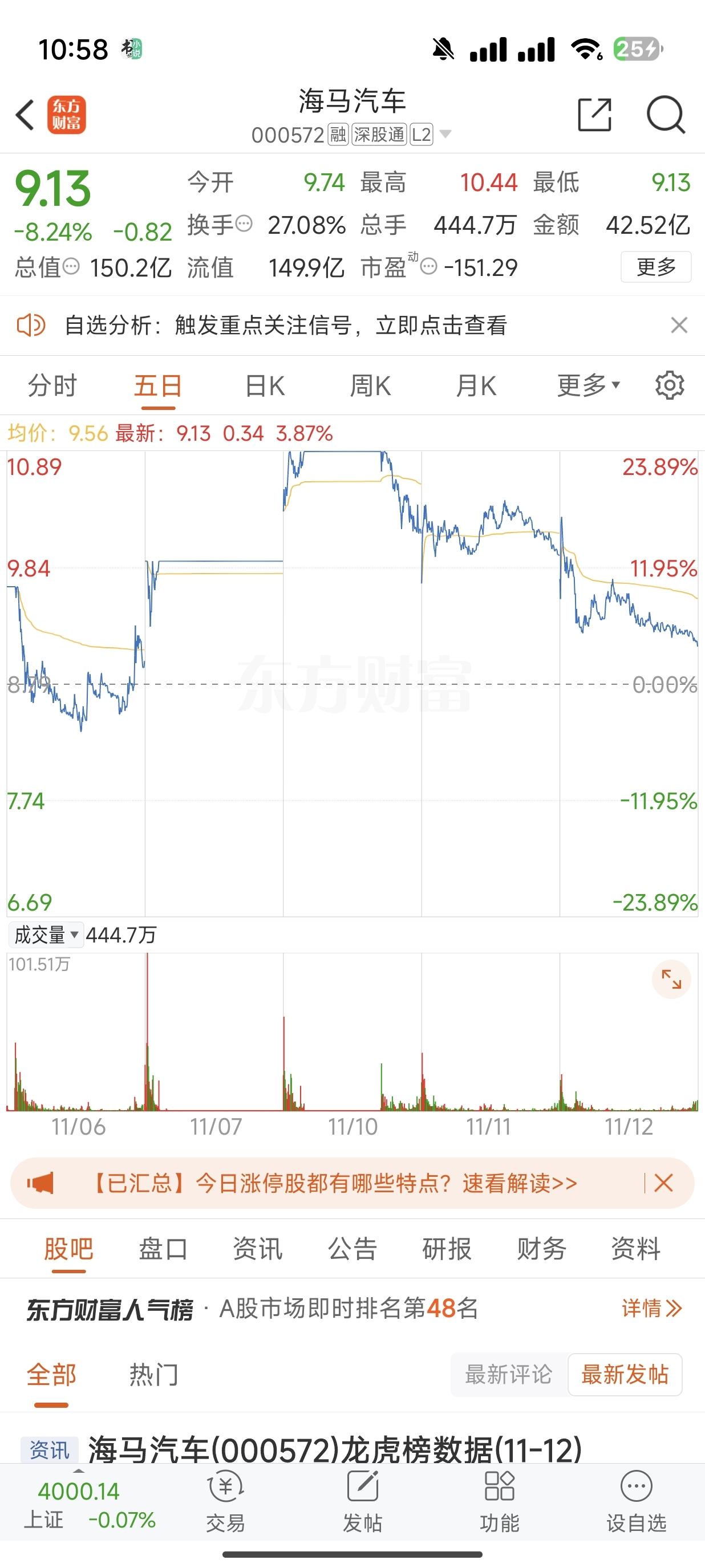 $海马汽车(SZ000572)$ 点开五日分时,看到6号就有大资金出去了,那天成交量放很大了,尾盘估计是提前收到消息拉了一把,续了口气,7号顶了个涨停板,10号板上继续跑路,11号12号开始没有像样的拉升了,13号怎么说?