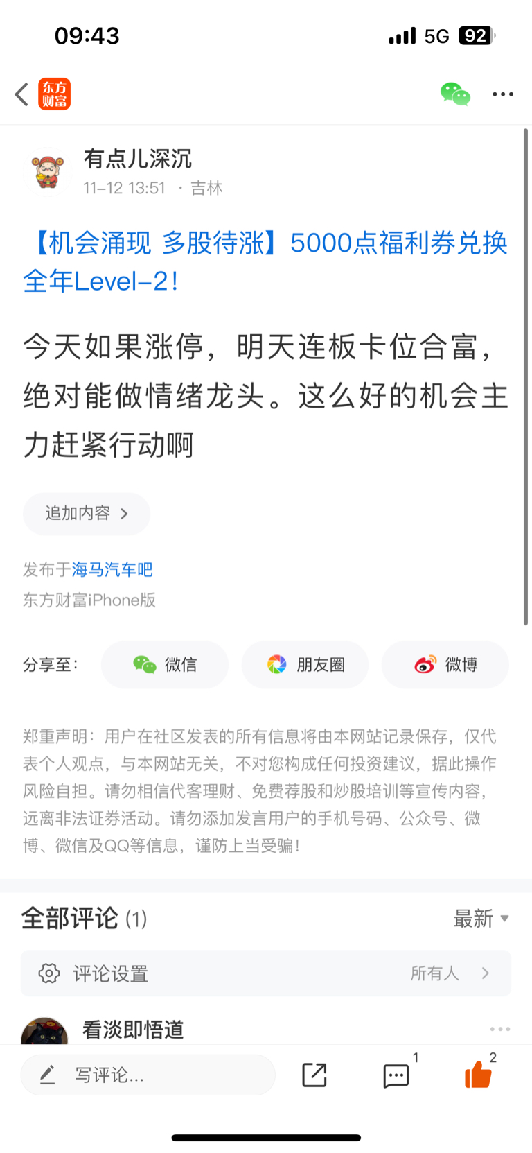 温馨提示: 1.根据《证券法》规定,禁止编造、传播虚假信息或者误导性信息,扰乱证券市场;2.用户在本社区发表的所有资料、言论等仅代表个人观点,与本网站立场无关,不对您构成任何投资建议。用户应基于自己的独立判断,自行决定证券投资并承担相应风险。《东方财富社区管理规定》