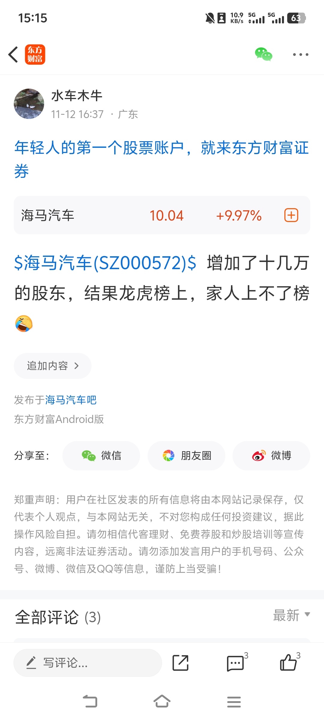 $海马汽车(SZ000572)$ 有人理解我昨天发的这个帖子吗,增加了十几万股东,11号震荡,12号大跌(这个大跌有点莫名其妙,因为没必要),结果12号硬生生砸出的榜居然看不到家人们,那么问题来了,11号和12号,是谁在承接,今天为啥又是缩量板,看懂了吗