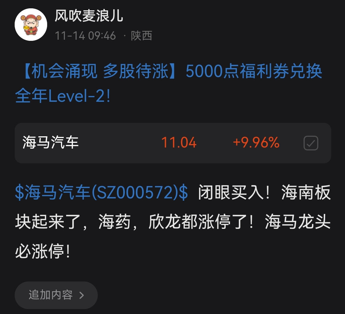 $海马汽车(SZ000572)$ 在龙头海马苦苦支撑着,海南板块今天终于动了,海药,欣龙等小弟纷纷涨停!今天,海马洗盘比较充分,抛压释放完毕!周末发酵,下周彻底进入海南自贸炒作一个月倒计时的周期!龙头有辨识度,充分享受板块溢价!拿紧到12.18,海马绝对超越常山,长城军工的存在!
