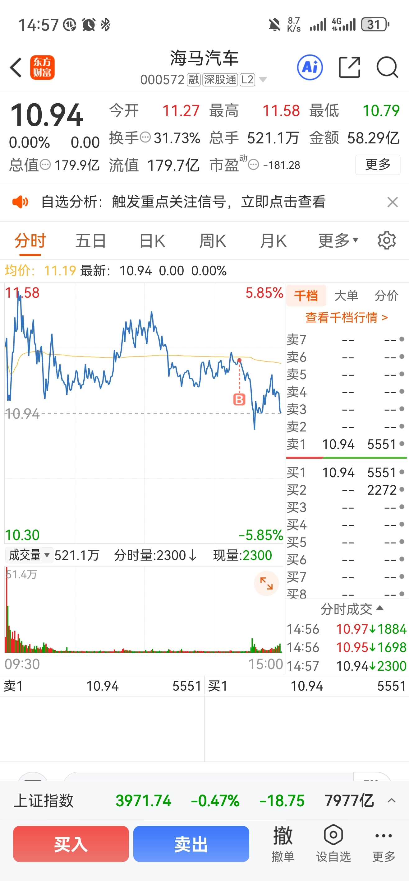 $海马汽车(SZ000572)$ 一买就套两个点,啥意思