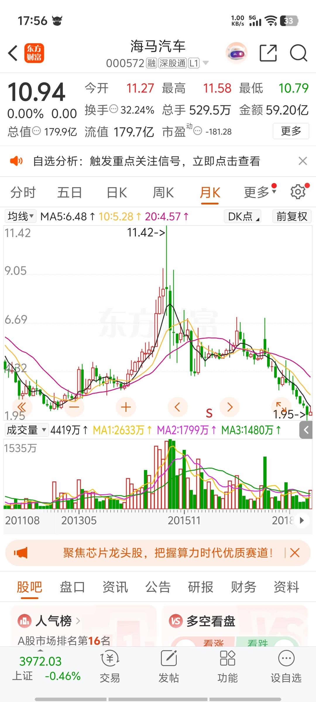 $海马汽车(SZ000572)$ 问题不大,今天过前高11.42元,有个回踩确认,明天后天只需要收盘价站上11.42元之上,即没有任何压力位。三天之内要站上,今天算一天。