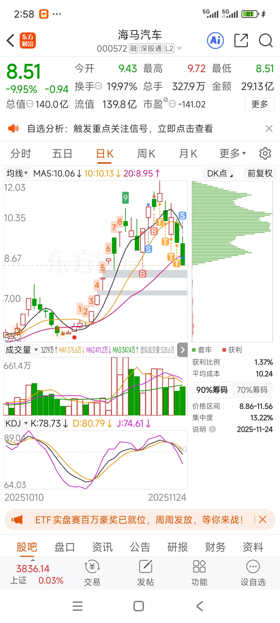 $海马汽车(SZ000572)$ 亏了20多个点,看筹码峰这样的情况,接下来不主动交出筹码,庄是不会有动作的,可能要到12月初情况才能逆转,这个股就不要在想着抄马概念这个事情了,大盘不确定性太大了,在这个市场没有任何积极向上的一面,都在想一切的方法割我们的血肉,而且是刮骨剃肉,本是同根生,相煎何太急。鱼与水么?