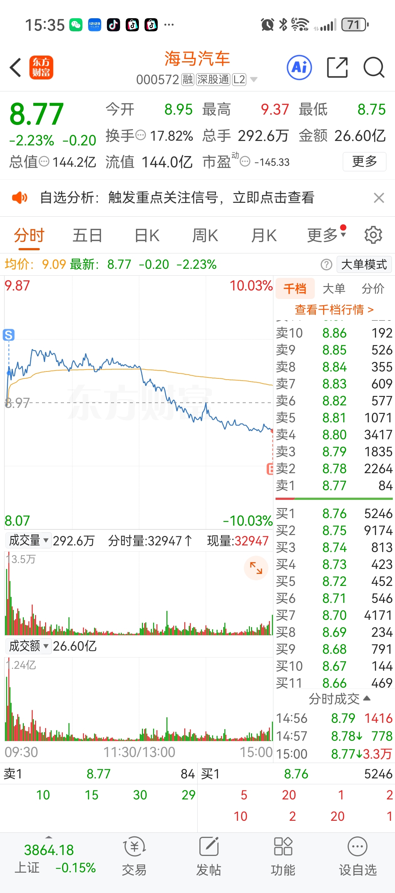 $海马汽车(SZ000572)$ 这段时间搞的就是冲高回落,为了保住利润,果断卖了,虽然卖早了。