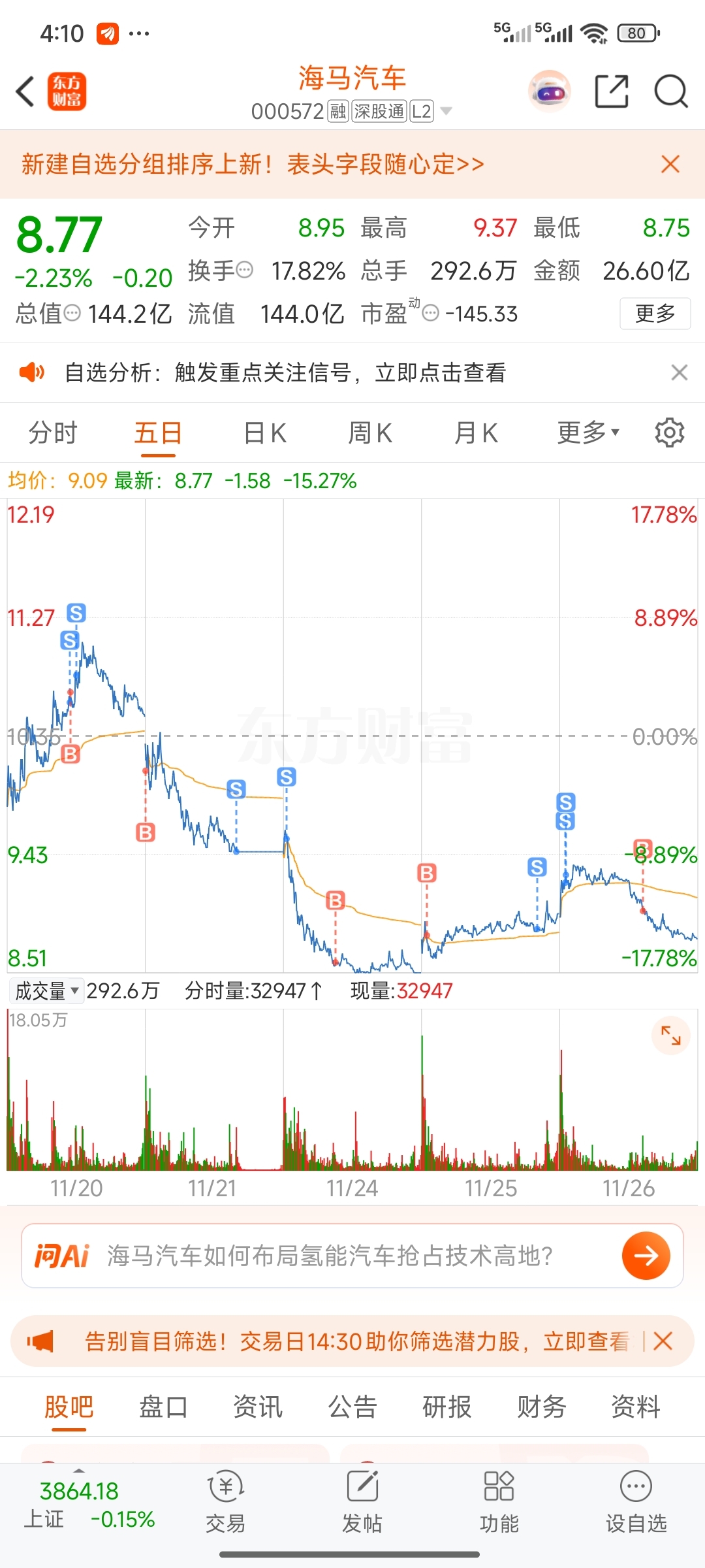 $海马汽车(SZ000572)$ 24号跌停没亏钱,昨天加仓,今天减仓 连续3天海马玩盈利。有点动摇了,走势实在是有点邋遢。。。