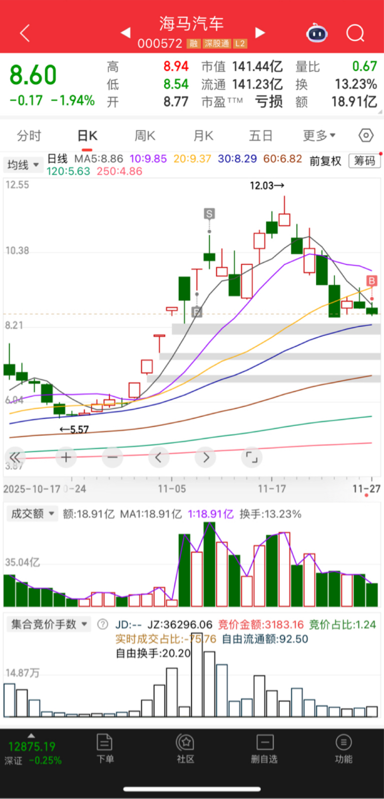 $海马汽车(SZ000572)$ 尾盘买了一个小马